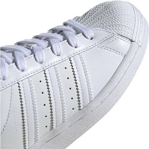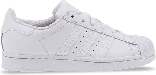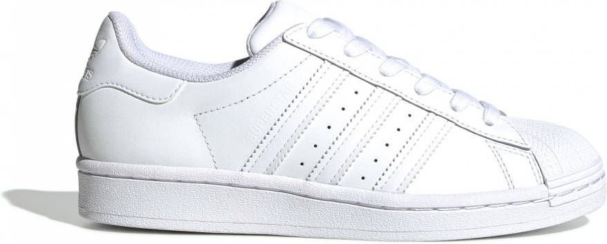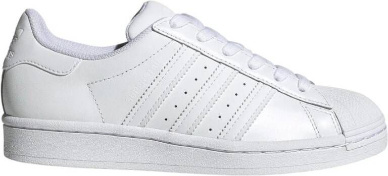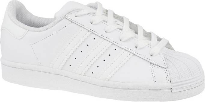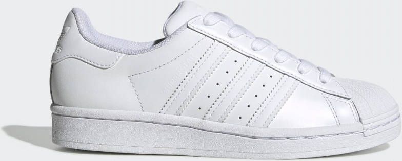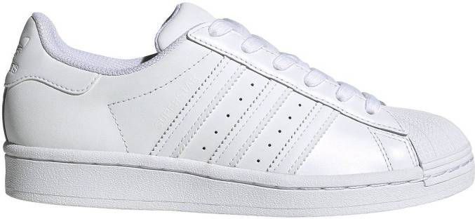 adidas Originals Superstar sneakers met vetersluiting voor meisjes in de kleur wit. Deze leren sneakers hebben een rubberen shell-toe en op de zijkant de drie kenmerkende strepen. Bovendien zijn de hak en de tong voorzien van het adidas Originals logo. De binnenkant is gevoerd met mesh en de inlegzolen zijn uitneembaar. De loopzool is gemaakt van rubber en heeft een grof visgraatprofiel.